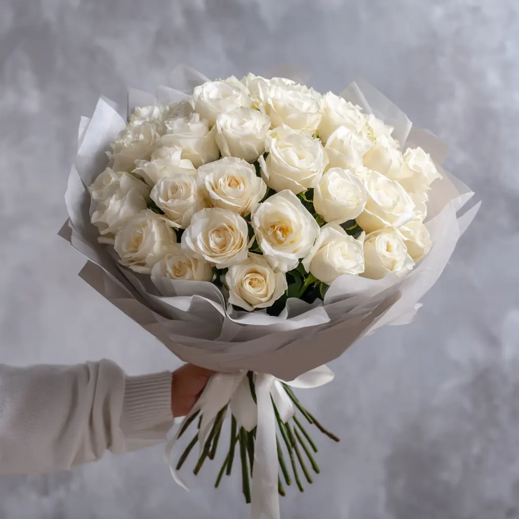 Белые розы в приглушённой палитре и упаковке цвета тумана — для создания атмосферы загадочности и элегантности. Такой букет говорит о глубине и осознанности чувств.