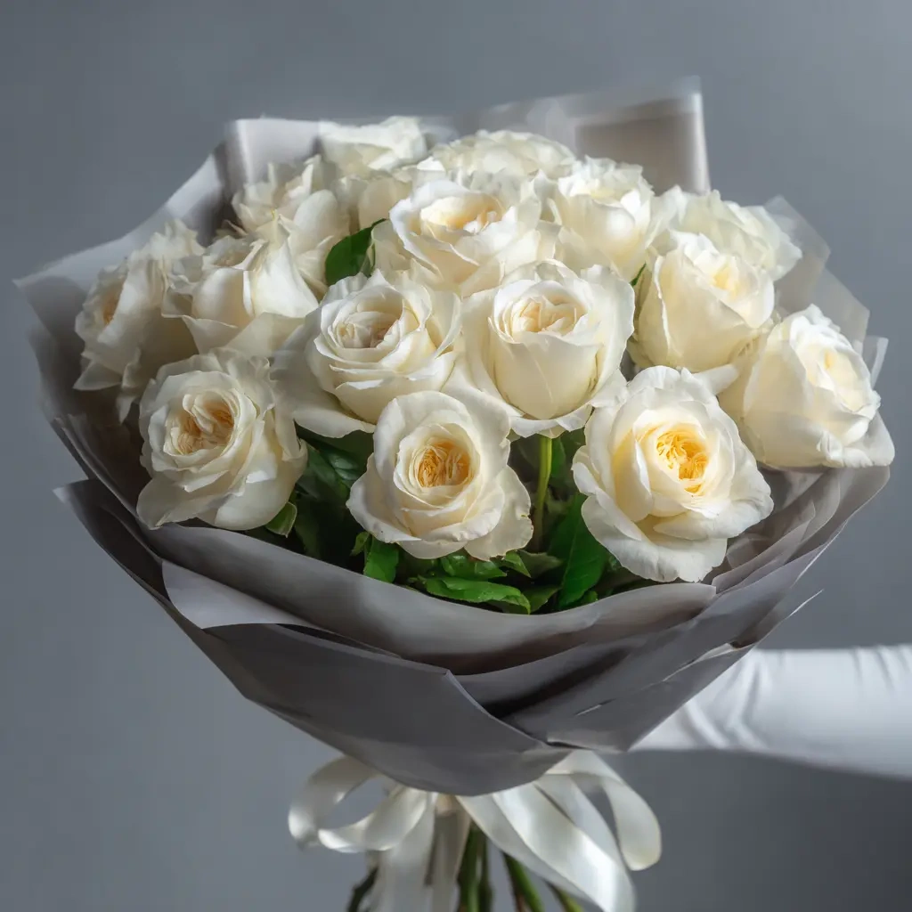 Светлый и тёплый, этот букет напоминает первые лучи солнца. Белые розы в стильной упаковке делают его идеальным подарком для любимой, мамы или коллеги. Сдержанная элегантность с нежной энергетикой.