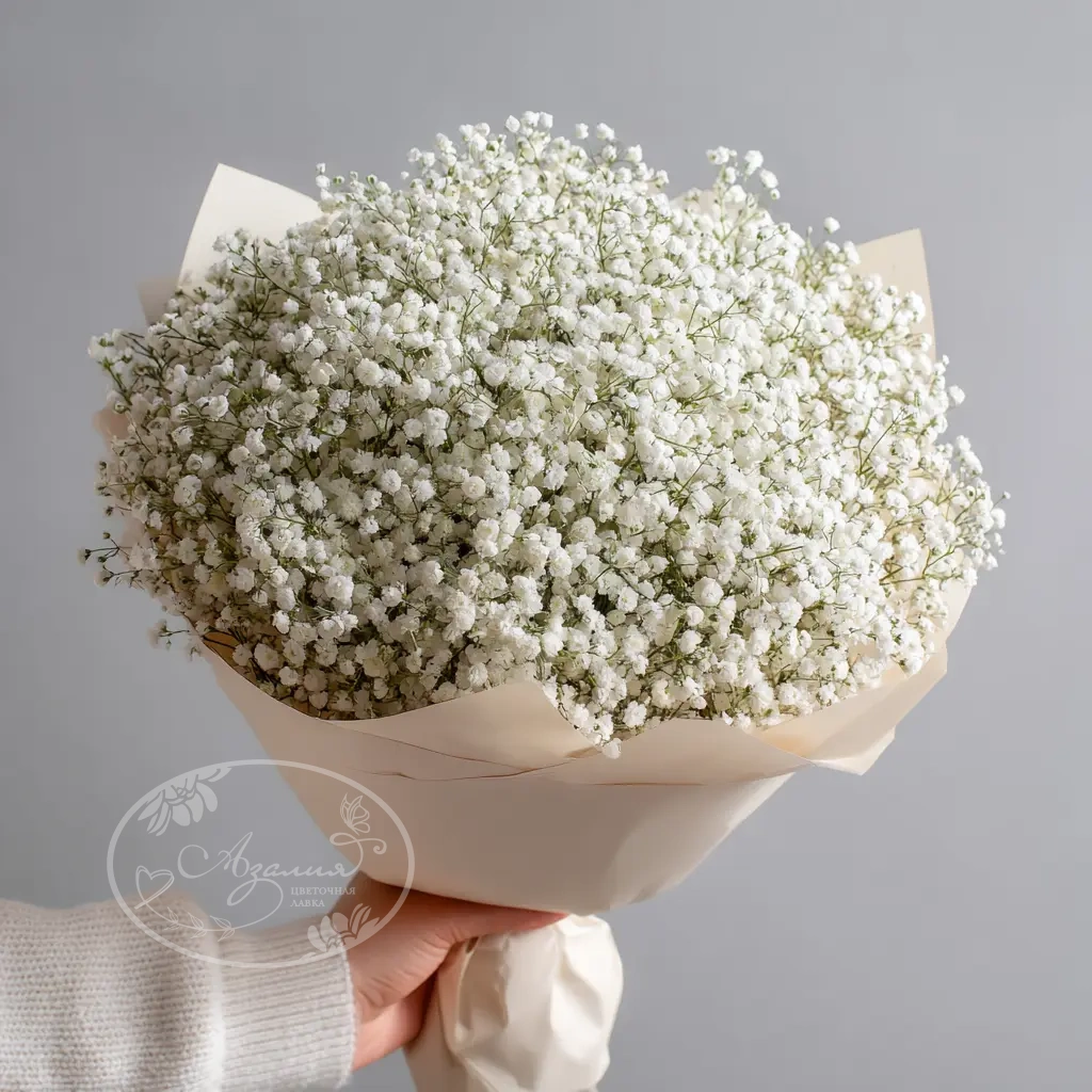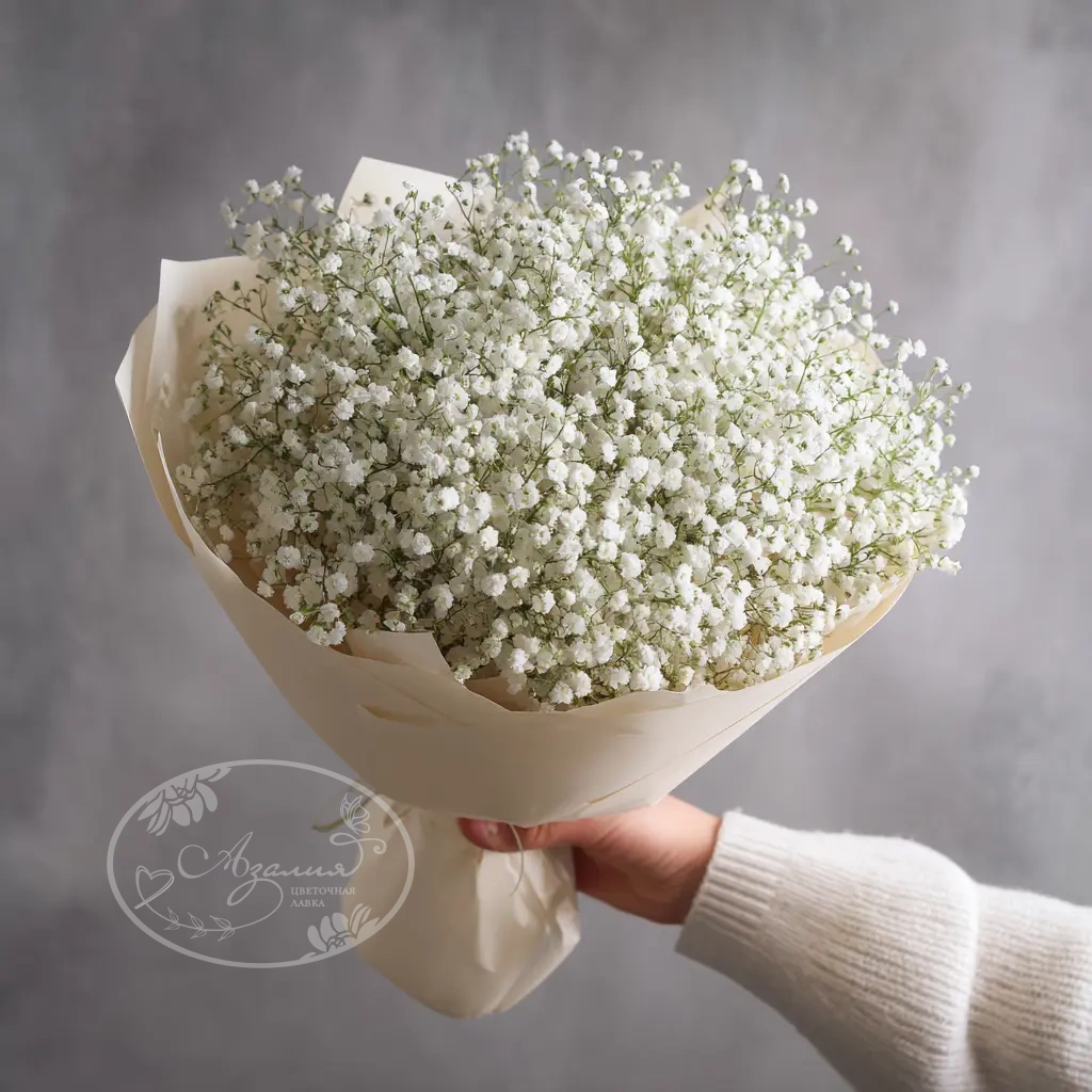 Лёгкий и изящный монобукет из белой гипсофилы — словно облако в руках. Подчёркивает чистоту чувств и гармонию. Отличный выбор для свадеб, фотосессий или подарка с минималистичной эстетикой.