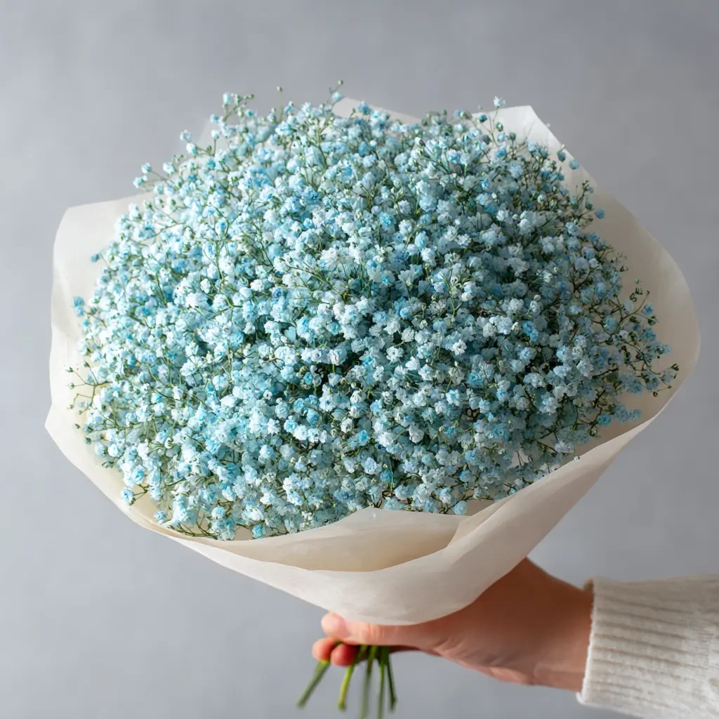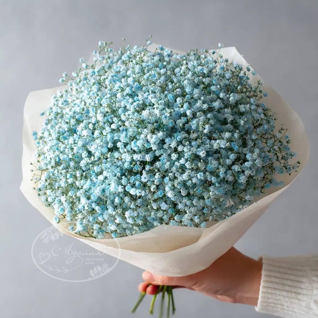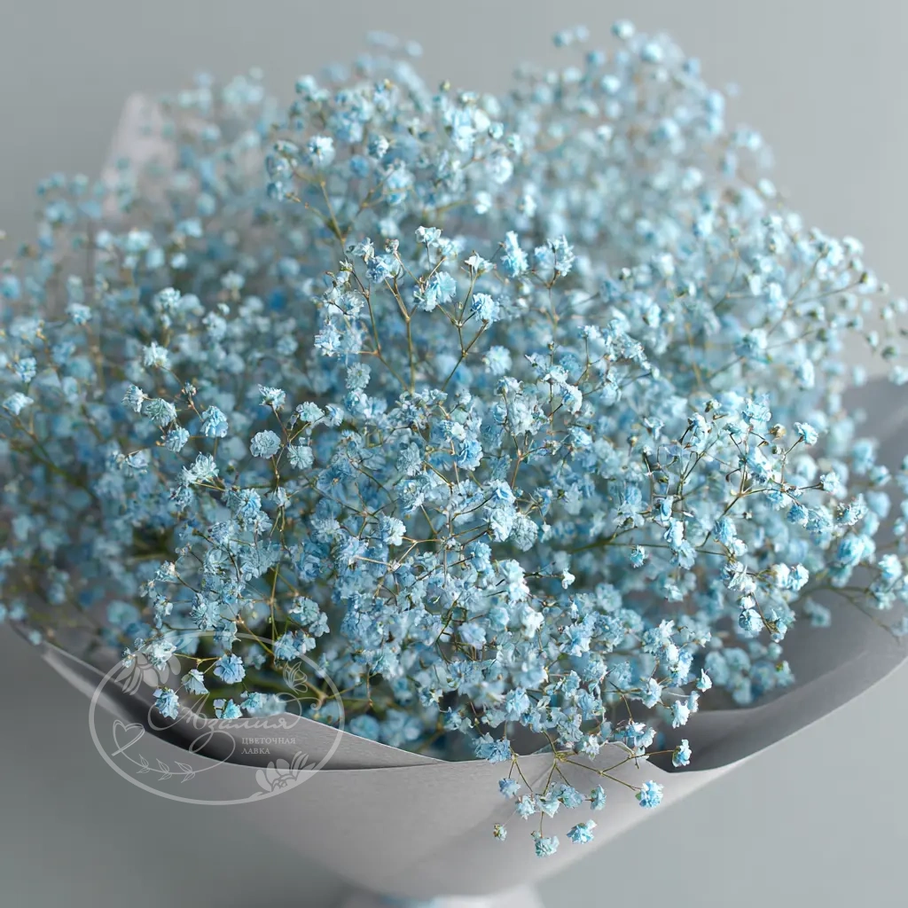 Современный и стильный выбор. Голубая гипсофила — тренд последних сезонов, отлично смотрится в фото- и видеосъёмках. Такой букет подойдёт как для молодёжных мероприятий, так и для оригинального комплимента.