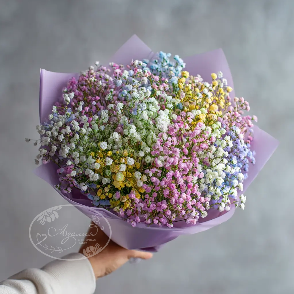 Богатая, объёмная структура создаёт ощущение цветочной волны. Гипсофила выглядит воздушно и динамично, а букет дарит настроение яркого торжества.