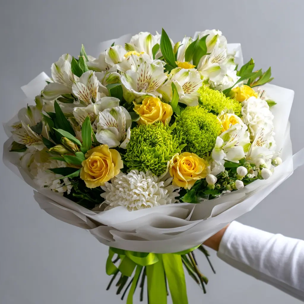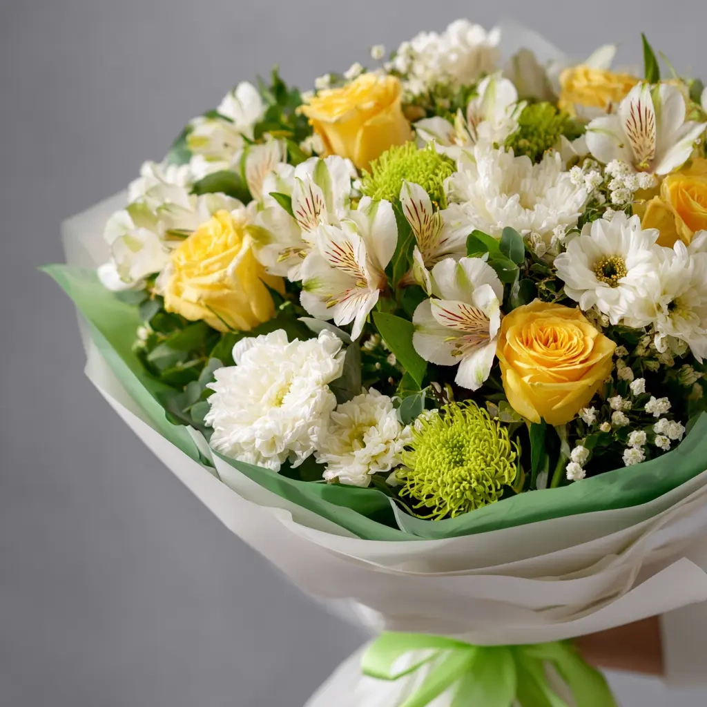 Композиция, как летняя песня — наполнена мягкими красками, теплом и светом. Альстромерии добавляют воздушности и утончённости. Универсальное решение для поздравления женщины или девушки.