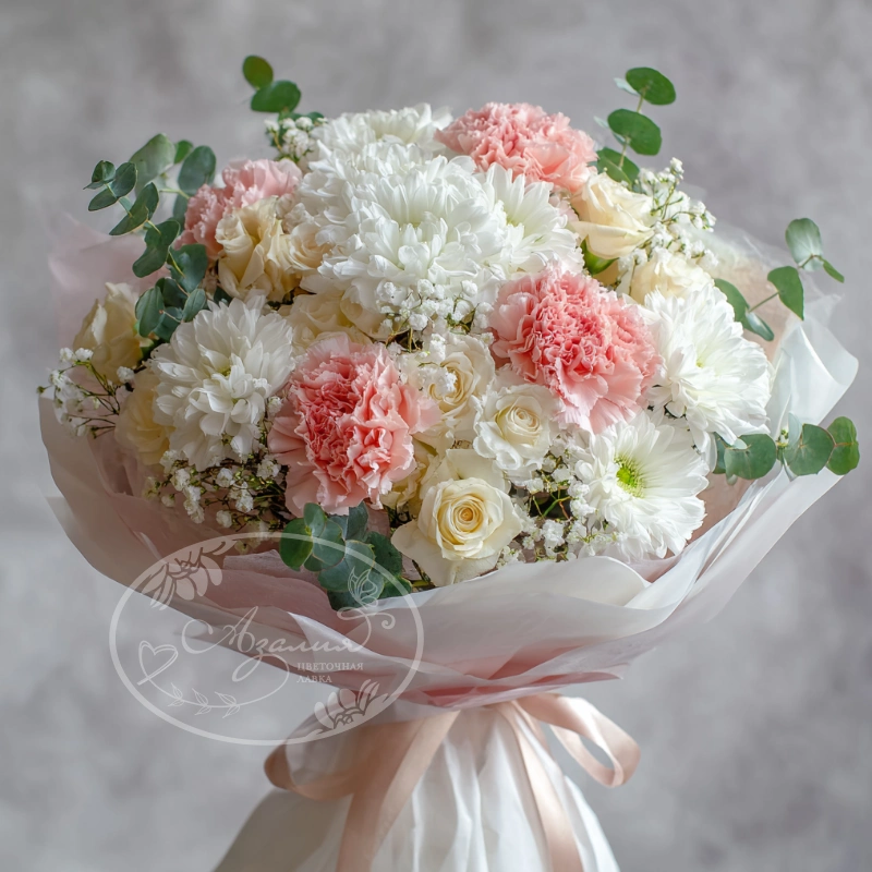 Нежно-розовые гвоздики с веточками эвкалипта — свежий и лёгкий букет, как утренний вдох.