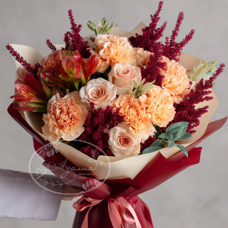 Кремовые гвоздики с бордовыми цветами — загадочный и благородный букет, создающий атмосферу роскошного вечера и незабываемого момента.