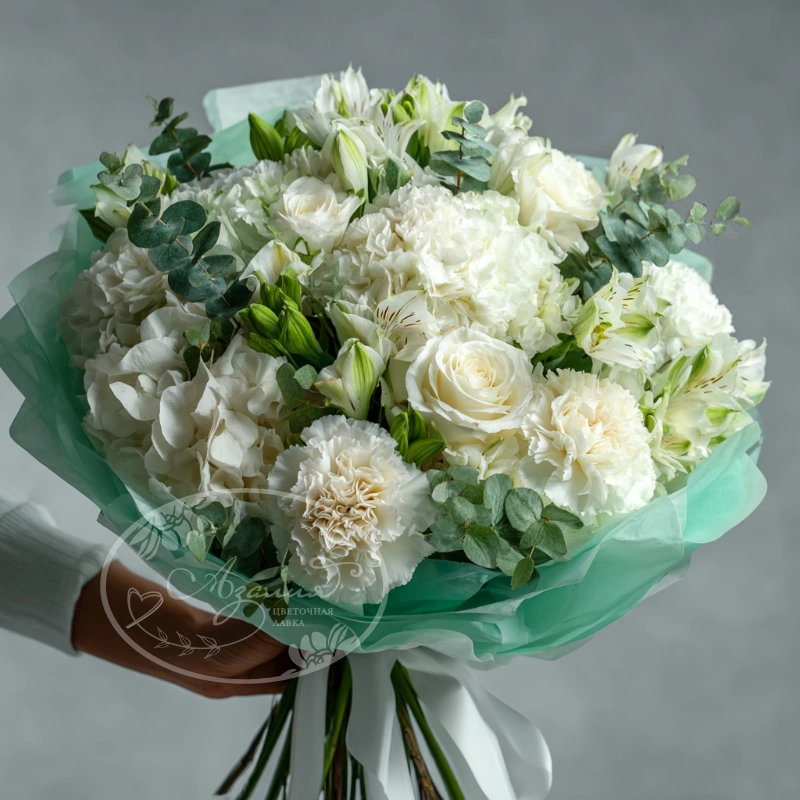 Лёгкий воздушный букет с нотками свежести создаёт ощущение прохлады. Отлично подойдёт для свадьбы, юбилея и дня рождения.