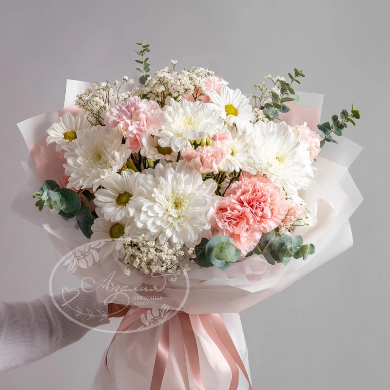 Яркий букет с гвоздиками и хризантемами, украшенный зеленью, идеально подойдет для праздника или чтобы поднять настроение близким.