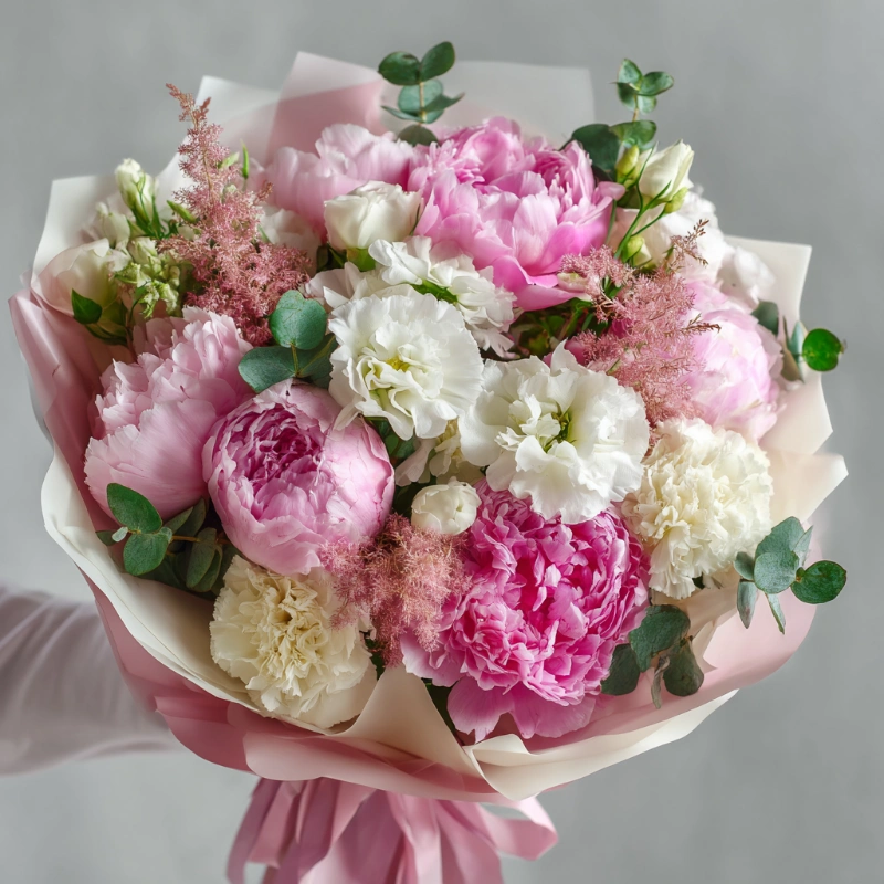 Букет с пионами «Снежное прикосновение»