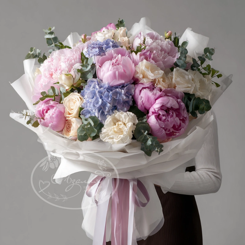 Нюдовая и приглушённая палитра — для любителей спокойной эстетики. Букет с пионами в мягких тонах гармонично подойдёт для деловых поздравлений или утончённого женского образа.
