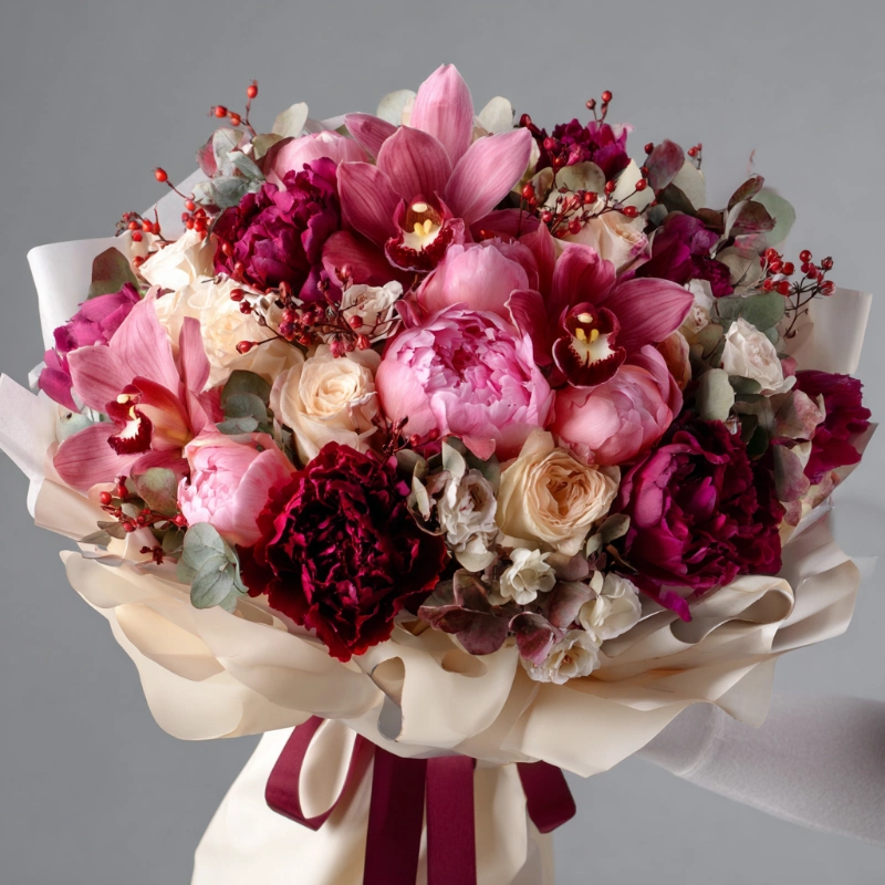 ГлавнаяКаталогБукетыПионыБукет с пионами «Рубиновая вуаль»