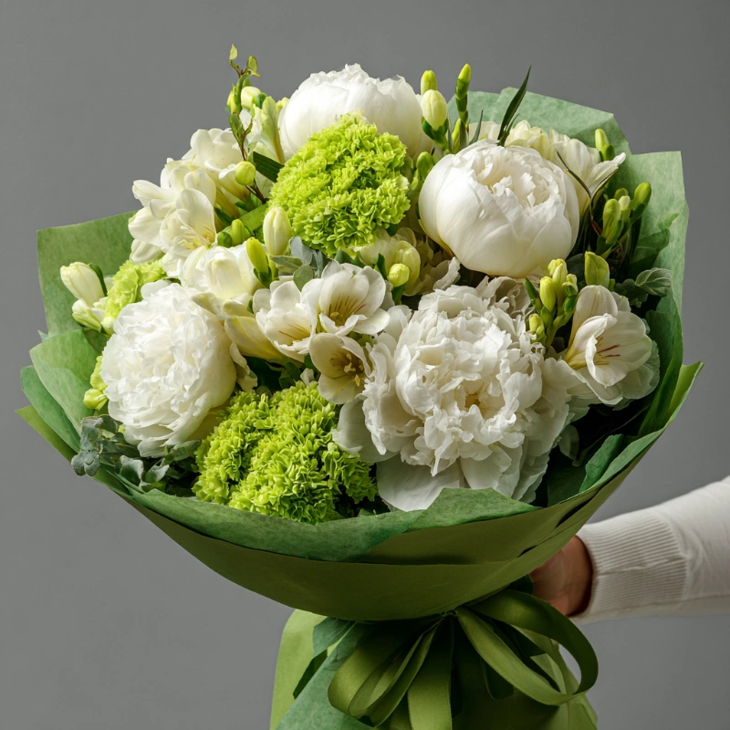 Букет с пионами «Снежное прикосновение»