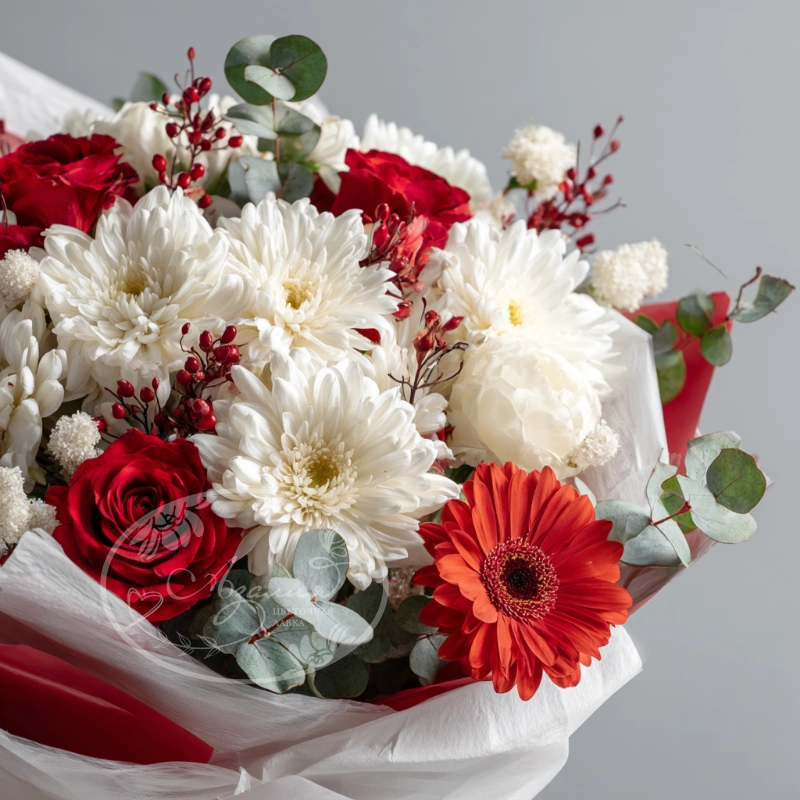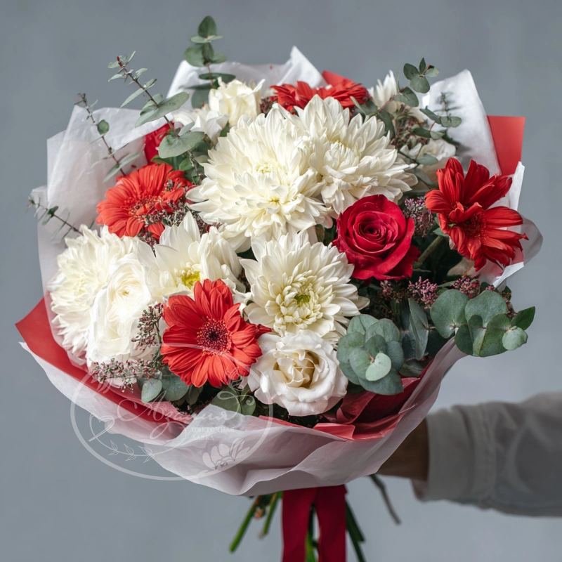 Собранный для торжеств и событий, этот букет наполнен яркими красками и хорошим настроением. Хризантемы долго сохраняют свежесть и эффектный вид, что делает их прекрасным выбором для праздника.