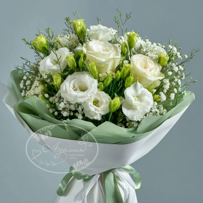 Белоснежная гамма и тонкие стебли — словно звон хрустального ветра. Эустомы придают композиции воздушность и элегантность. Букет, который говорит о любви, уважении и заботе.