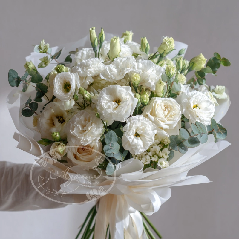 Полупрозрачная цветочная история, созданная из воздушных эустом. Букет в бежевых и молочных оттенках — выбор для свадеб, крестин или символа чистоты и лёгкости.