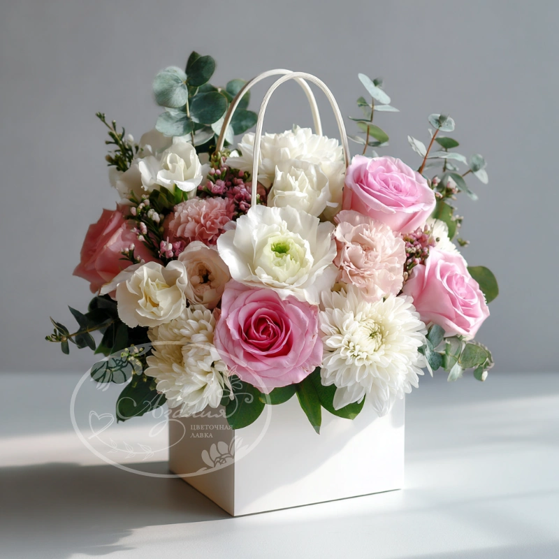 Цветочная композиция в пастельных тонах словно создана для романтичных и трепетных моментов. Отлично подойдёт для подарка подруге, сестре или любимой.