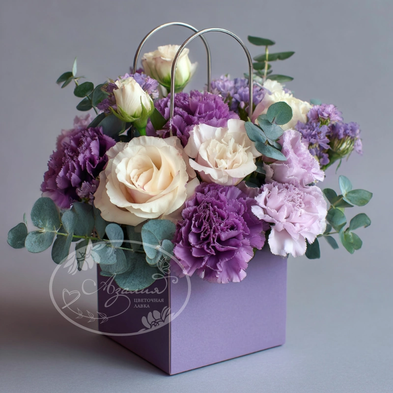 Современный флористический тренд: букет в стильной сумке с яркими нотами цвета и лёгкого аромата. Создан для модниц и тех, кто любит дарить стиль.