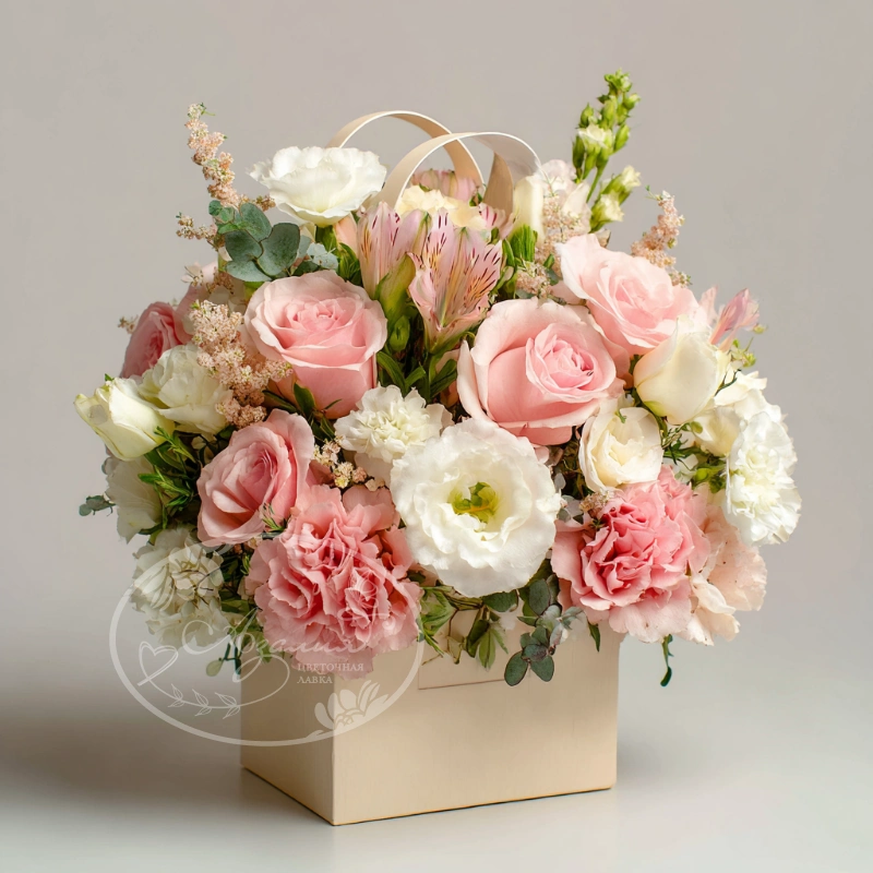 Цветочная нежность в компактной упаковке. Сочетание мягких оттенков и милого дизайна делает букет идеальным выбором для девушки любого возраста.