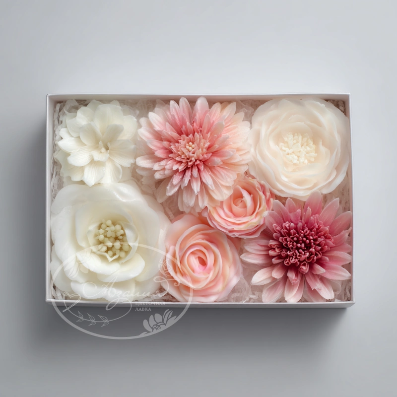 Набор мыльных цветов в пастельных тонах, напоминающих первые лучи утреннего солнца, подарит ощущение спокойствия и умиротворения. Лёгкие ароматы персика, мимозы и ванили создают атмосферу нежности, а натуральный состав мыла бережно заботится о коже, делая её мягкой и гладкой.