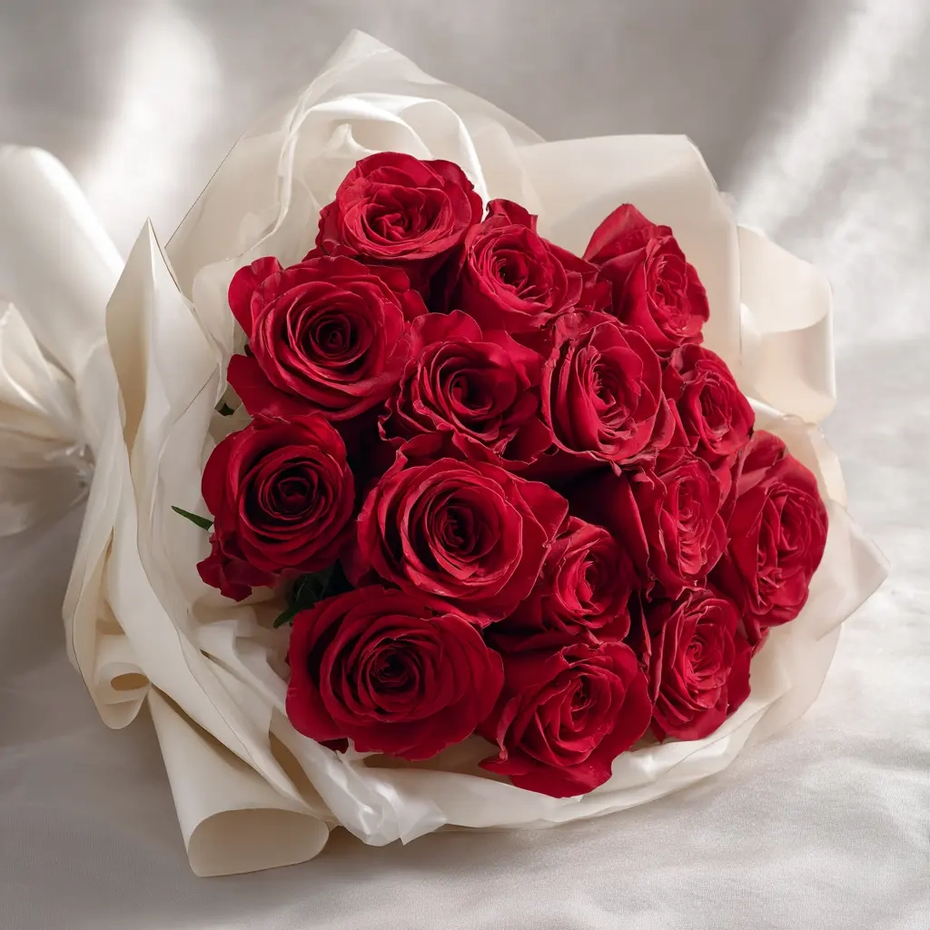 Роскошный букет из 15 алых роз с длинными стеблями — классика жанра. Подойдёт для свидания, предложения руки и сердца или выразительного комплимента.