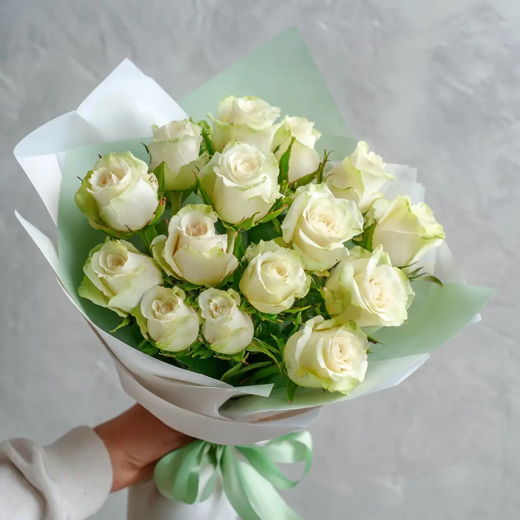 Сдержанный и лаконичный букет из 15 белых роз отечественного производства — выбор для тех, кто ценит натуральность и простоту. Подойдёт как для деловых случаев, так и для поздравлений близких.