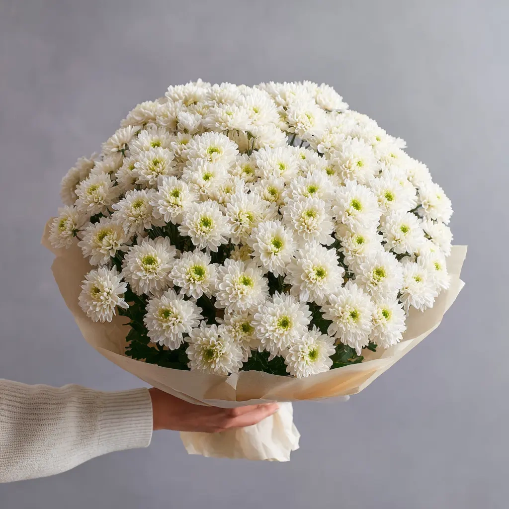 Классический букет из белых кустовых хризантем. Подойдёт для офиса, поздравлений, свиданий и просто — чтобы сделать день ярче.